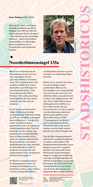 Hier, op de eerste verdieping, woonde stadshistoricus Beno Hofman van 1999 tot 2023. In zijn werkkamer boven de poort – met uitzicht op de voormalige stadswal – schreef hij boeken, toneelstukken en filmscripts, ploos stambomen uit en bestudeerde oude kadastrale kaarten.