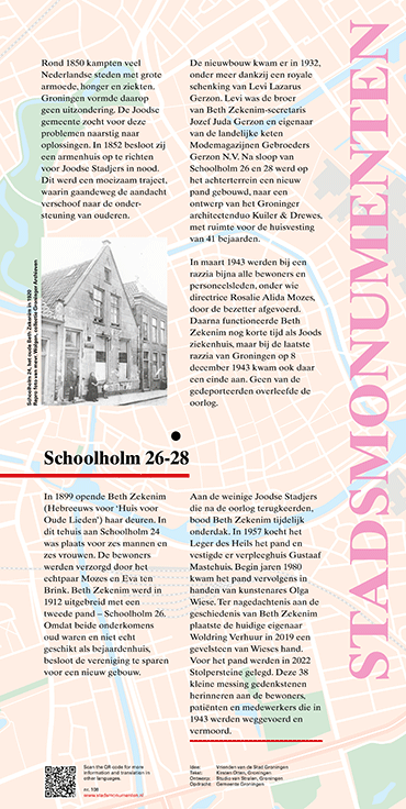 De nieuwbouw kwam er in 1932, onder meer dankzij een royale schenking van Levi Lazarus Gerzon. Levi was de broer van Beth Zekenim-secretaris Jozef Juda Gerzon en eigenaar van de landelijke keten Modemagazijnen Gebroeders Gerzon N.V. Na sloop van Schoolholm 26 en 28 werd op het achterterrein een nieuw pand gebouwd, naar een ontwerp van het Groninger architectenduo Kuiler & Drewes, met ruimte voor de huisvesting van 41 bejaarden.